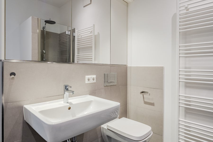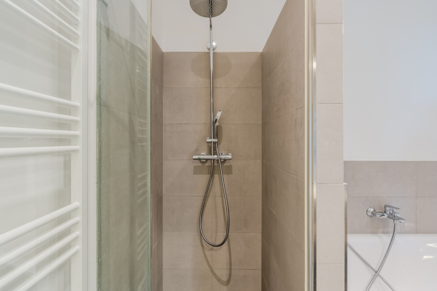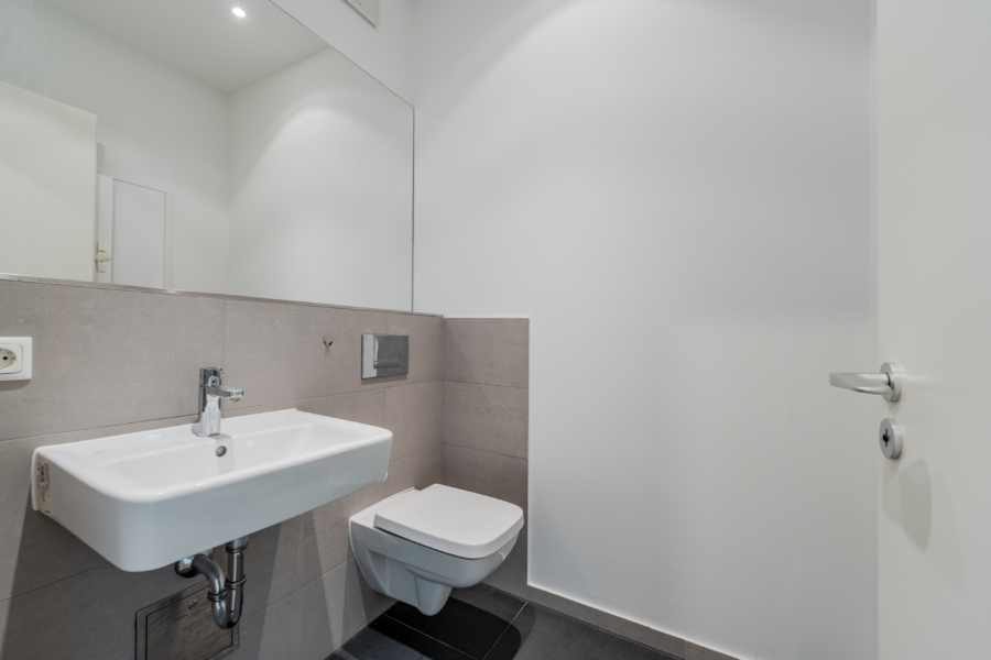 Das stilvolle Badezimmer ist mit einer bodengleichen Regendusche und einer Badewanne ausgestattet. Ein separates Gäste-WC sorgt für zusätzlichen Komfort. Die hochwertige Küche fügt sich nahtlos in den offenen Wohn- und Essbereich ein und ist mit modernen Geräten inklusive Spülmaschine, Gefrierschrank und Dunstabzugshaube ausgestattet.