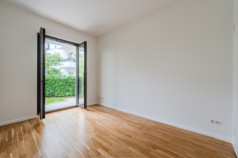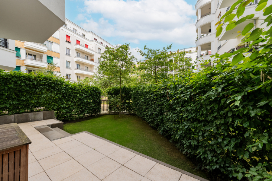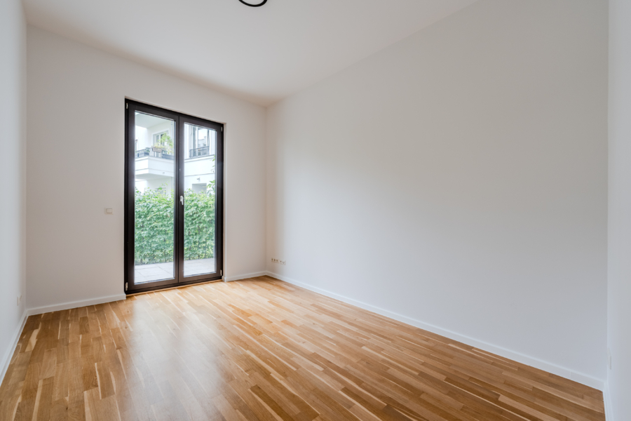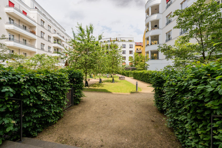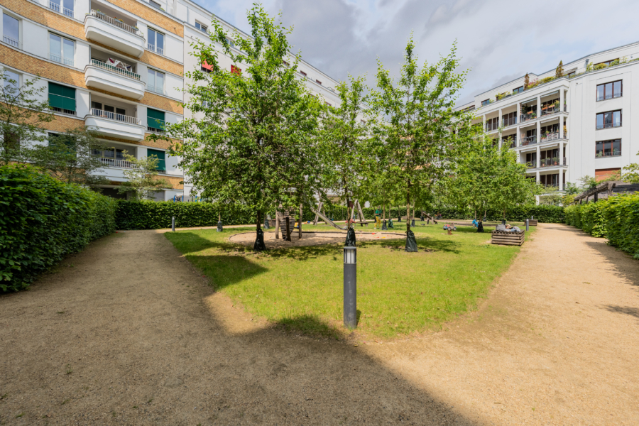 Zwei der Schlafzimmer bieten direkten Zugang zum Garten, der über ein eigenes Tor in den nur für Anwohner zugänglichen Innenhof führt – mit grünem Rückzugsort und schönem Kinderspielplatz. Auf der gegenüberliegenden Seite lädt eine sonnige Südterrasse zum Verweilen ein.