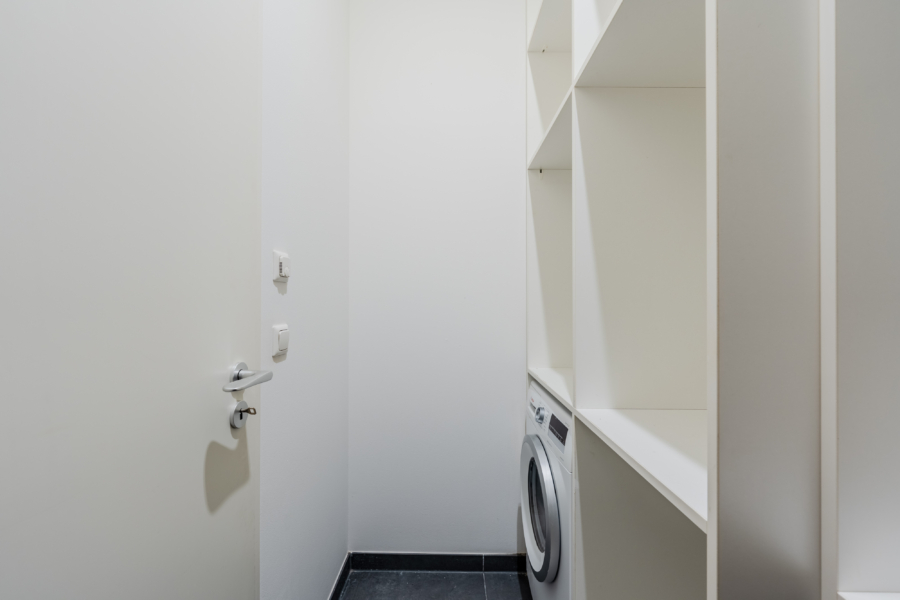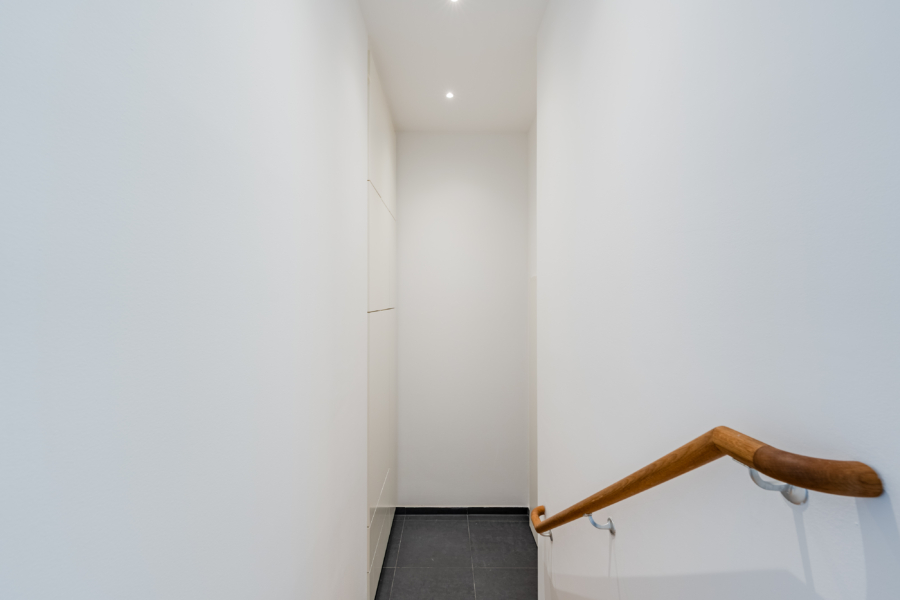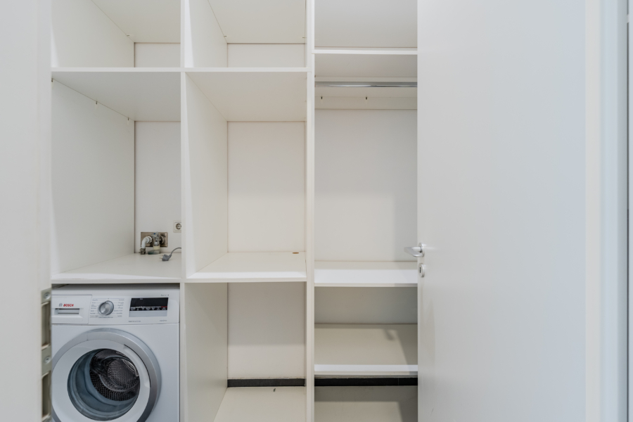 Im Entrée bietet ein deckenhoher, maßgefertigter Einbauschrank viel Stauraum. Zusätzlich steht ein vollständig ausgebauter Hauswirtschafts- bzw. Abstellraum mit weiteren Einbauschränken zur Verfügung – praktisch und durchdacht für den Alltag.
