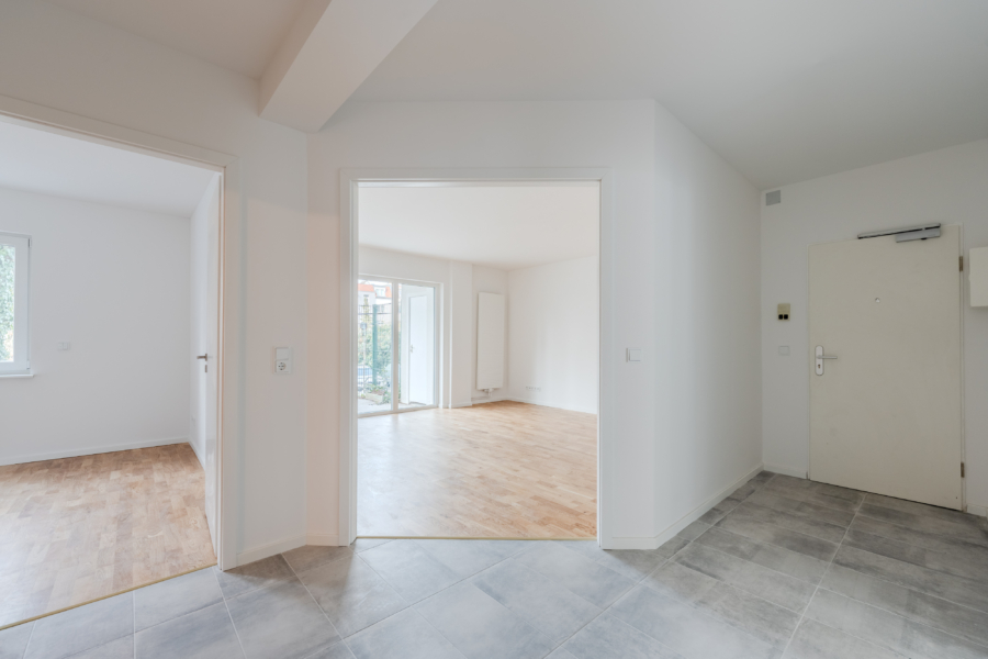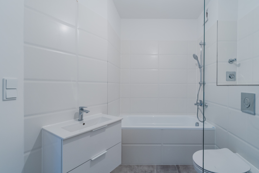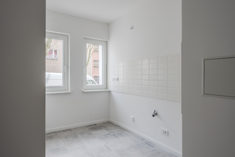 Das Badezimmer wurde ebenfalls komplett erneuert und mit exklusiven Sanitärelementen sowie eleganten Fliesen ausgestattet, die Design und Komfort miteinander verbinden. Auch die Küche wird für Ihre individuellen Einrichtungsideen vorbereitet und bietet ausreichend Platz für eine gemütliche Sitzecke.