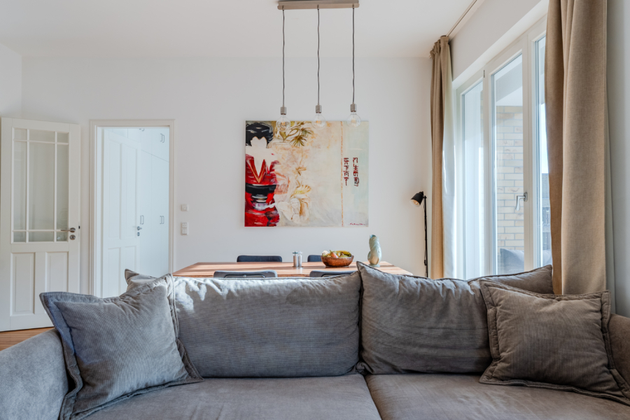 Die Wohnung überzeugt mit einer modernen, hochwertigen Ausstattung und einer klaren, zeitlosen Gestaltung. Der lichtdurchflutete Wohnbereich mit offenem Küchenkonzept schafft ein angenehmes Raumgefühl. Die Einbauküche ist vollständig ausgestattet und bietet reichlich Stauraum. Hochwertige Einbauschränke sorgen für zusätzliche Ordnung und Ästhetik, während stilvolle Kassettentüren und maßgefertigte Gardinenstangen von Silent Gliss dem Interieur eine elegante, harmonische Note verleihen.