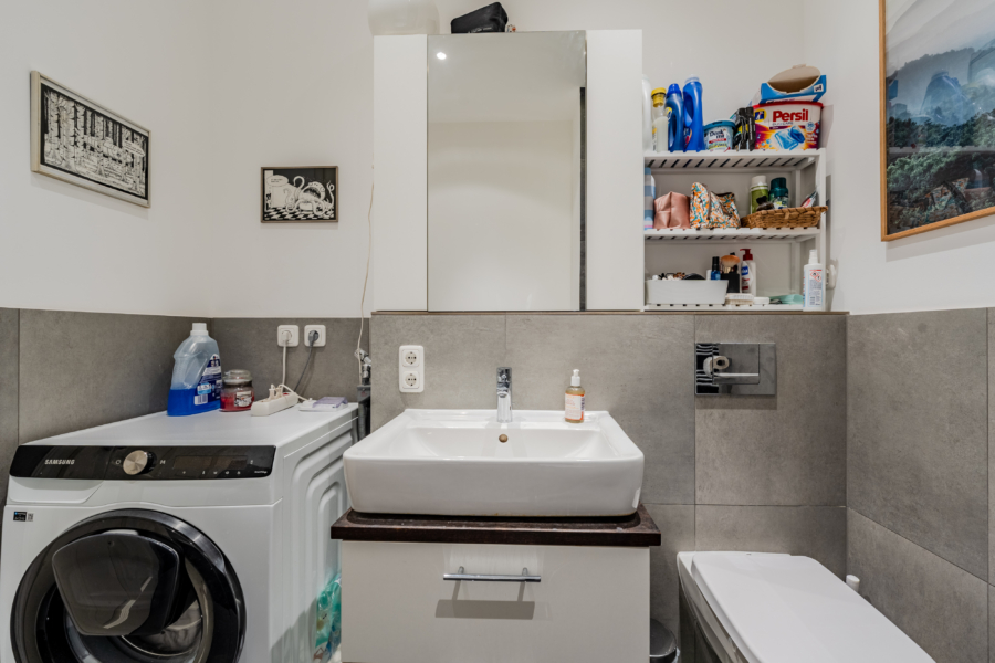 Das Badezimmer ist modern gestaltet und mit hochwertigen Materialien ausgestattet. Eine Badewanne, stilvolle Armaturen und die Kombination von hellen und dunklen Fliesen schaffen einen eleganten, zeitlosen Eindruck. Ein separater Hauswirtschaftsraum mit Waschmaschinenanschluss bietet zusätzlichen Komfort und Ordnung.